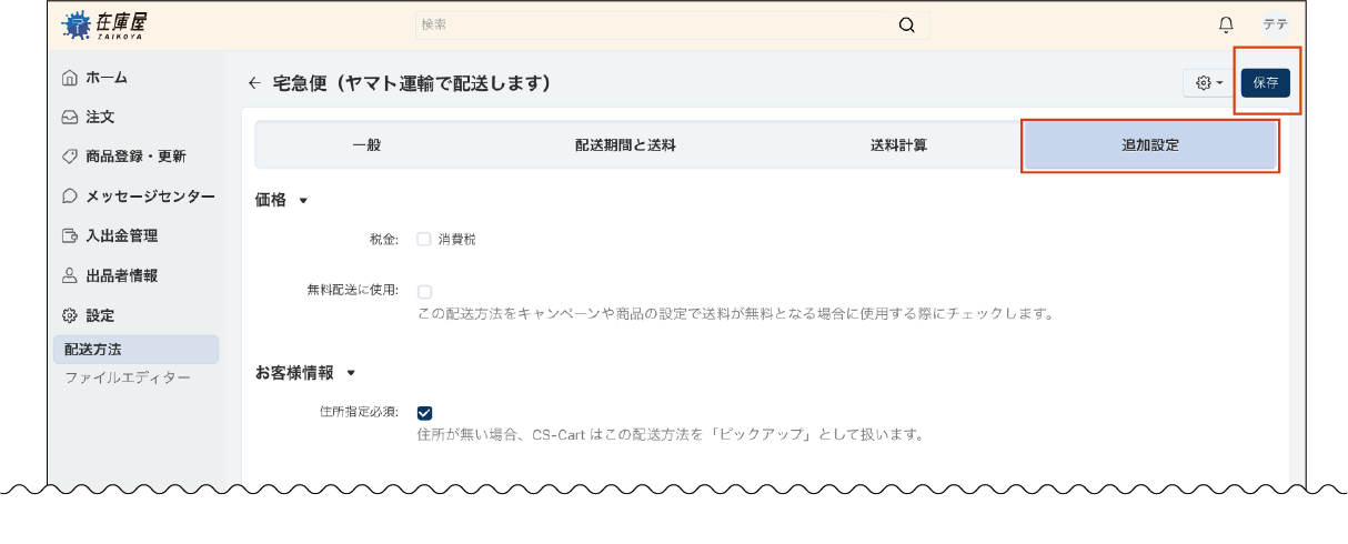 設定内容を確認の上、画面右上の「保存」ボタンをクリックし、配送方法の基本設定を完了します。