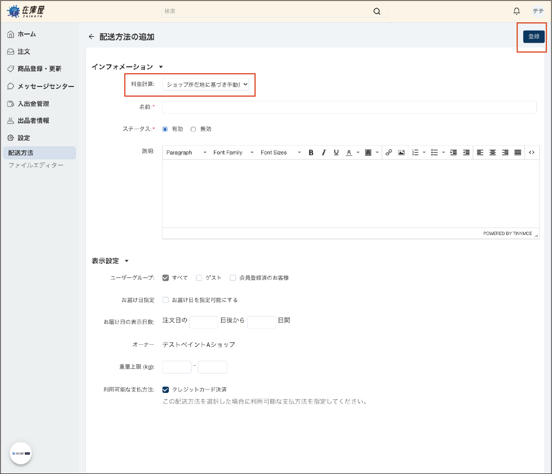設定内容を確認の上、画面右上の「登録」ボタンをクリックし、配送方法全般の登録が完了します。