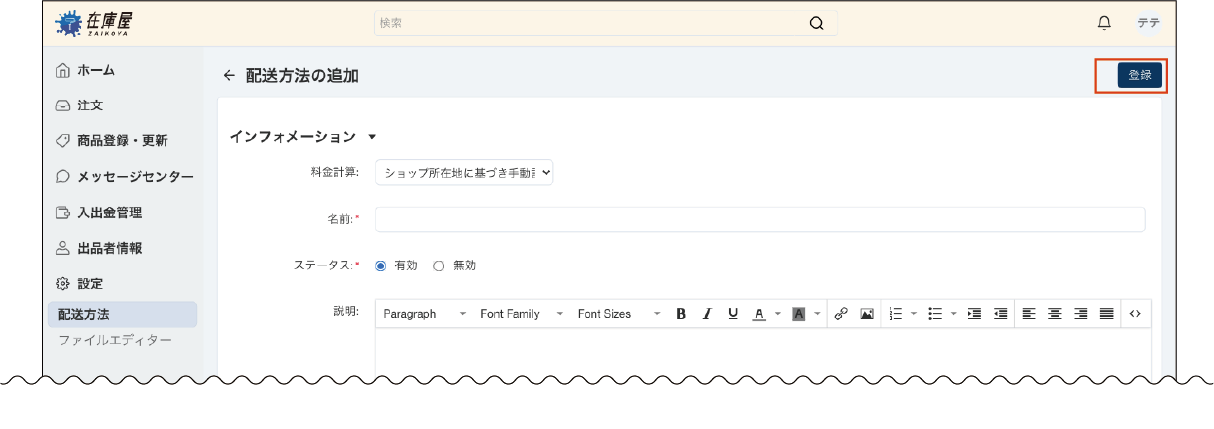 設定内容を確認の上、画面右上の「登録」ボタンをクリックし、配送方法の基本設定を完了します。