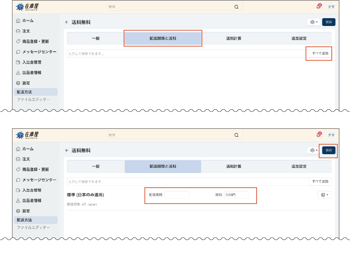 未設定の場合「商品が購入できない」「送料0円」となってしまいますのでご注意ください。