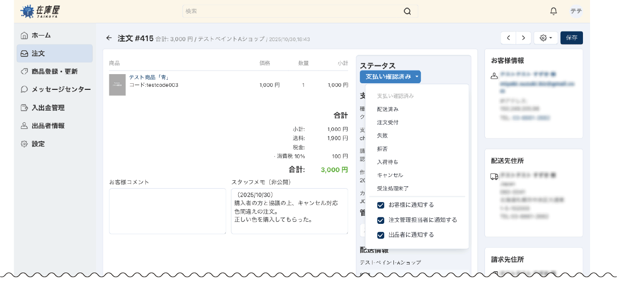 - 出品者管理画面のメニュー「注文」から該当注文の注文詳細画面を表示します。