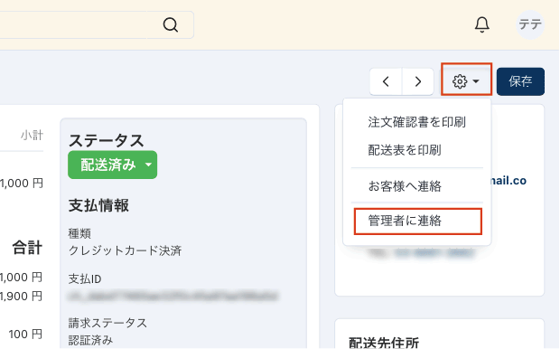 - ページ上部の歯車アイコンをクリックし「管理者に連絡」を選択し、メッセージ入力画面を開きます。